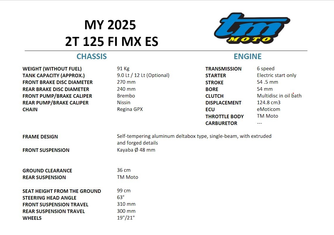 TM Racing Motocross 2 Stroke - 2025 MX 250 FUEL INJECTED ES Dirt Bike Specifications